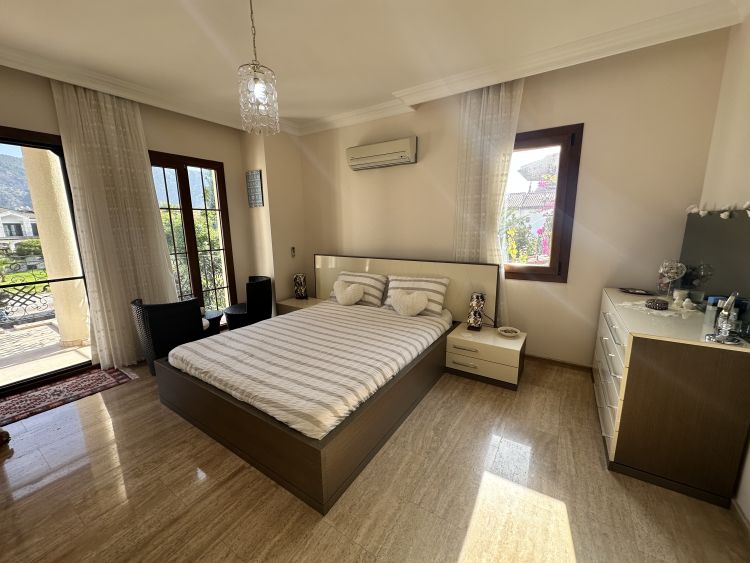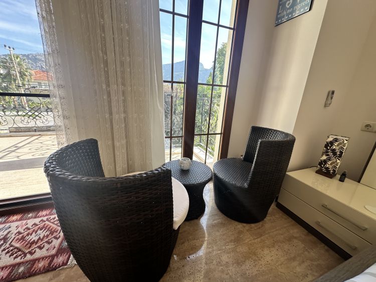 The second upstairs bedroom is also a spacious double, thoughtfully fitted with wardrobes and sharing the same broad front balcony,the perfect place to greet the sunrise. The third first floor bedroom, another comfortable double, features a charming Juliet balcony that opens to the fresh Dalyan air.