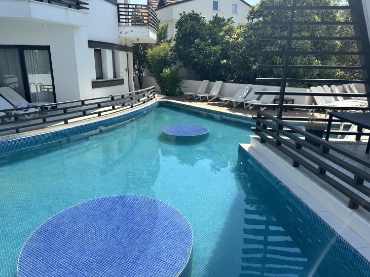 Set within an exclusive complex of only 10 apartments, you enter via a beautiful wooden bridge to your own private entrance. The centrepiece is the swim up pool with unique lily pad seating, surrounded by a spacious shared sunbathing terrace. Your large private terrace opens directly to the pool, creating the perfect spot for morning coffee or evening cocktails.