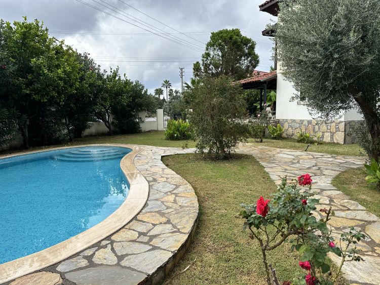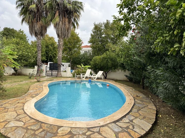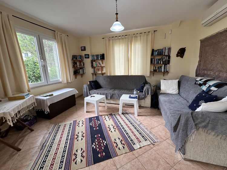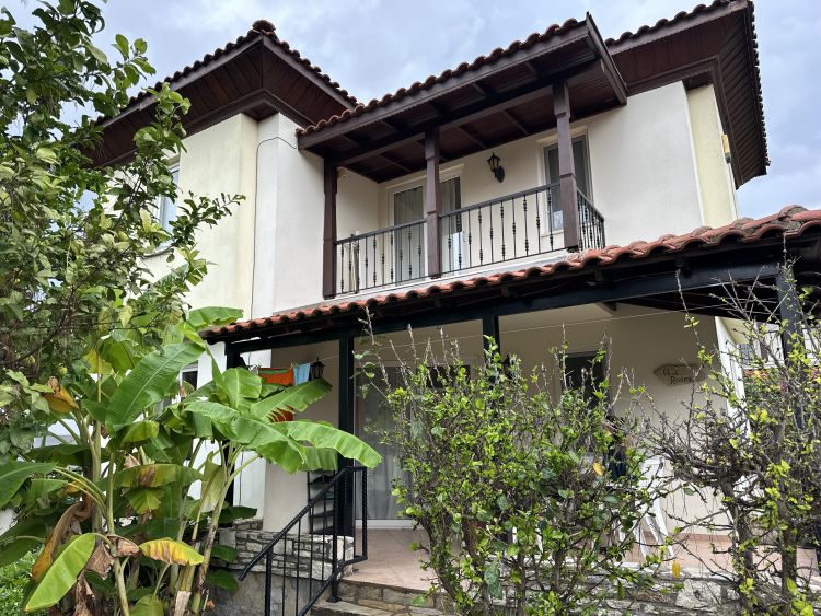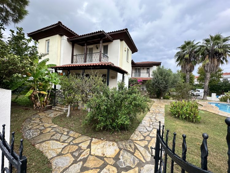 Located in the desirable Gulpınar area of Dalyan, just a 5 minute walk from town, this attractive detached villa sits on a peaceful complex of just two properties, sharing a large swimming pool and beautifully maintained lush gardens. The setting combines calm surroundings with convenient proximity to Dalyans shops, restaurants, and riverside, ideal for those who want both tranquillity and accessibility.A covered front terrace provides a shady and welcoming entrance to the home, perfectly suited for outdoor living and dining throughout the year. Inside, the openplan lounge leads directly through to the kitchen, creating an easy flow between living spaces. The kitchen is in its original style, practical and functional, while the lounge area is neat and comfortable, offering plenty of natural light.